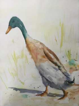 (right) Running Duck, watercolour by Lindsey Bond (15” x 11”, NFS, ref: 008)