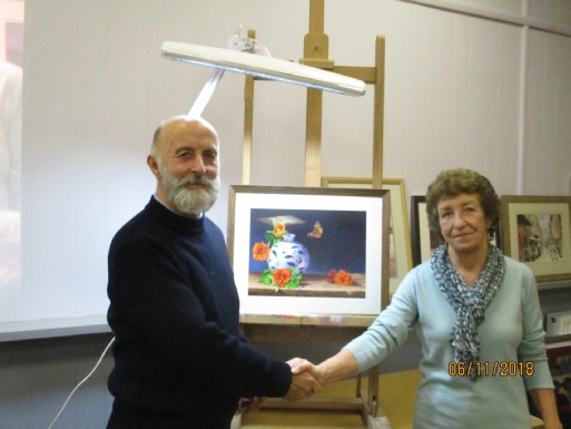 Over 40 members braved a wet and wild night and almost 30 paintings were submitted. Roger, as usual, gave us the benefit of his vast experience and took time to look in depth at each piece of work and offer advice. All members are rewarded by the critique of each others work and learn so much from his fair and impartial comments. Roger chose his 'top 2', explaining that it is always a difficult choice, and the standard is so high, that he chooses on a personal basis, Overall favourite was a stunning still life from Gillian Roberts and Tony Batey was runner up with a superb marine painting. The Society extend their thanks to Roger, and look forward to welcoming him back.