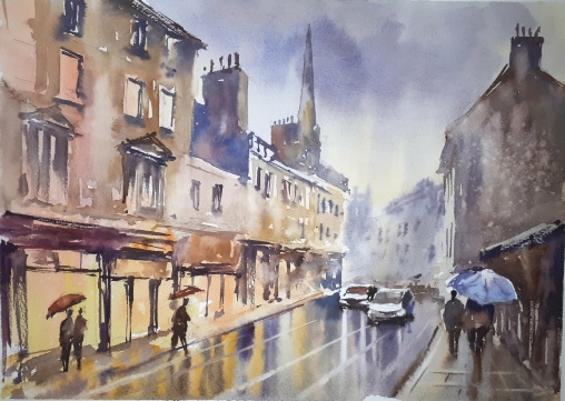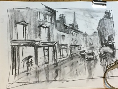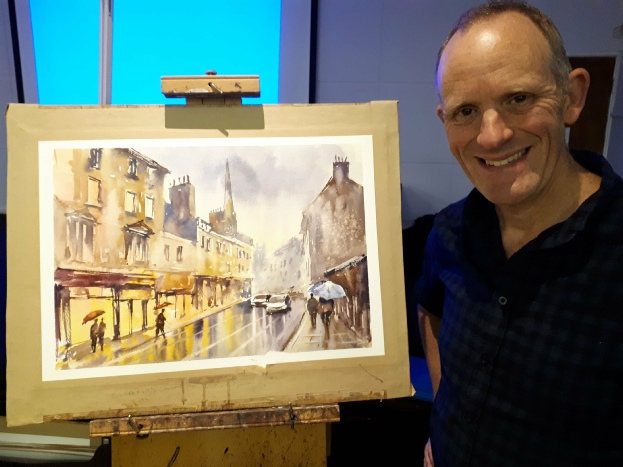Paul talked us through the stages of developing a city scene, starting with the importance, especially in watercolour, of a tonal sketch. He then went on to demonstrate how to achieve a loose vibrant painting.