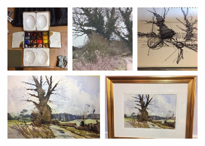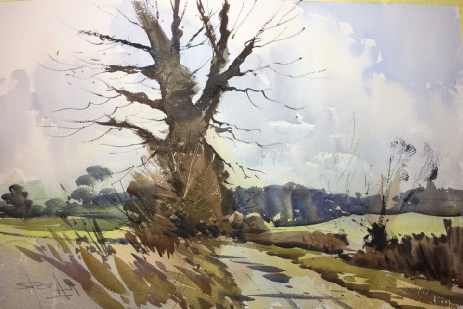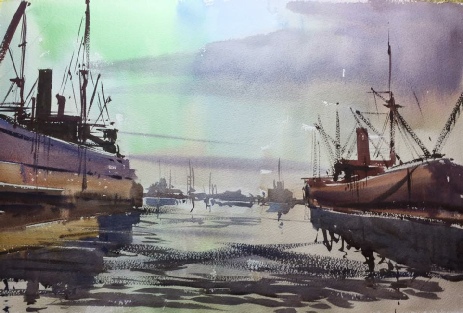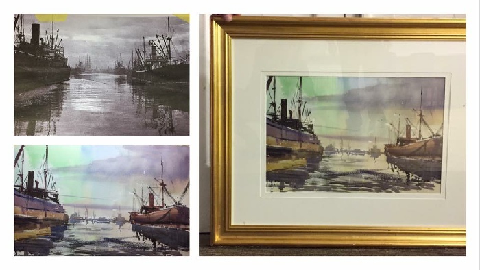 This evening we were very privileged to see artist Steve Hall complete two amazing watercolour demonstrations. Steve referred to a photo to plan his own composition. He did a quick Notan sketch to block out basic shapes before painting a landscape. The second picture was created in a similar way, depicting ships in Glasgow dock.