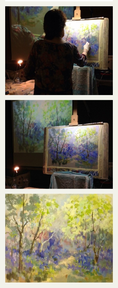 This evening, Susanna Gilmore Powell demonstrated painting a Bluebell Wood, using pastels. Using vibrant colours, she created shapes, blending them together to produce a beautifully bright & colourful picture.