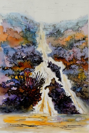 (Below right) Waterfall, Brecon Beacons, watercolour & ink, by Harriet Jenkins