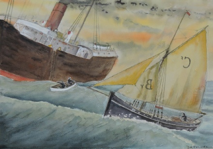 (Right) Cardiff Pilot Cutter Putting Pilot aboard, watercolour, by David Phillips