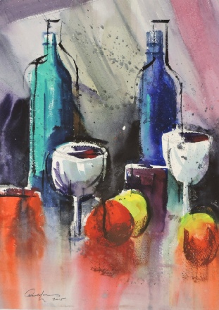 (Right) Bottles, watercolour, by Arnold Lowrey
