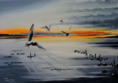 (Right) Photobombing Seagulls, acrylic, by Sylvia Hughes-Williams