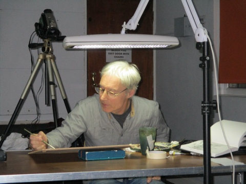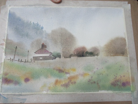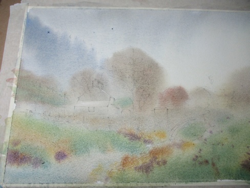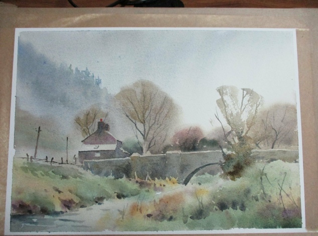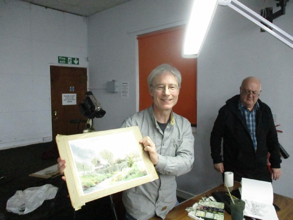 Peter is the most generous of artists, when demonstrating or teaching; he shares his knowledge of the medium in a way that is simple and practical. He explained how he always gives his painting a title, at the outset, to enable him to keep on track and focus on what caught his eye in the first instant...how he keeps his washes loose initially, and that he introduces variants of colour into these, and incorporates hard and soft edges, lost and found edges, tone, shape, colour in that order. He also makes us laugh!! We watched an amazing painting 'develop' over the course of the demo...which given the initial delay, was a masterclass in painting, talking and entertaining all at the same time....at speed, under pressure!