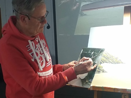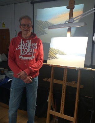Nick demonstrated his method of using acrylic paint applied thickly onto a primed wooden board. The subject was "Watch Tower Bay" near Barry. He created a sunset sky, applying and blending the colours with a palette knife.