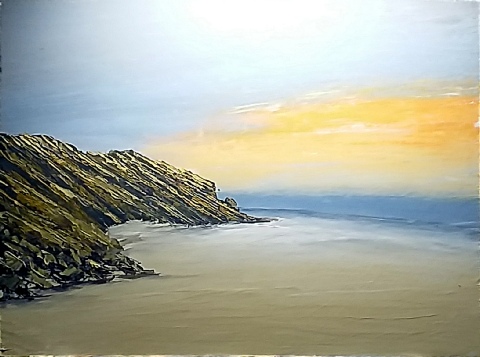 The horizon was masked with a tape to get a straight line. Continuing to blend the sea and beach colours, Nick sculpted the headland with a dark grey mix, and then created striations on the rocks of a golden hue to reflect the warmth of the lower sky.