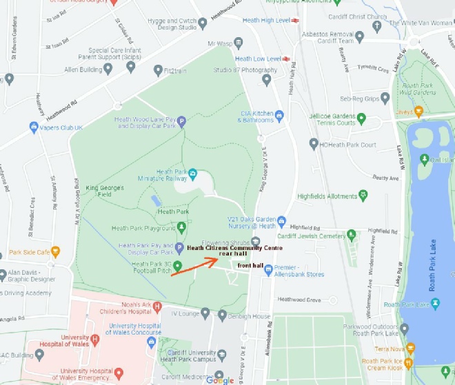 Regular Tuesday meetings and the Monday evening workshops are held in the rear hall at the Heath Citizens Community Centre, King George V Drive, Cardiff. For those of you with a Sat Nav, the postcode is CF14 4EP. Please see the map below.