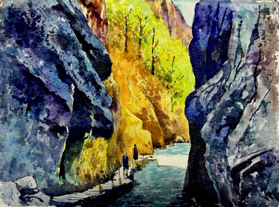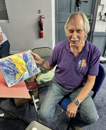 We were pleased to welcome back Barry Herniman (aka ‘Herr Flick’) +to SWAS on Tuesday evening. It was Barry’s first visit for seven years and he gave us a splendid demonstration of how he achieves his textures with his renowned ‘flicks’. He also showed us how the Schminke Horadam gouache that he uses could be used similarly to watercolour, but without losing the opacity of the gouache, so they could be used in painting light over dark - unlike watercolour. His subject was the Samaria Gorge in Crete. A great evening - thank you, Barry.
