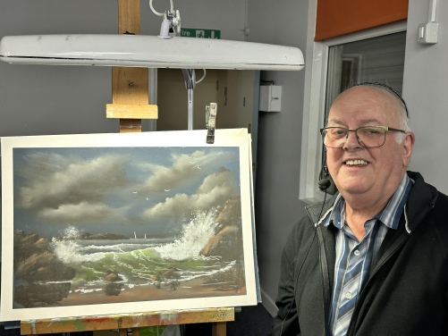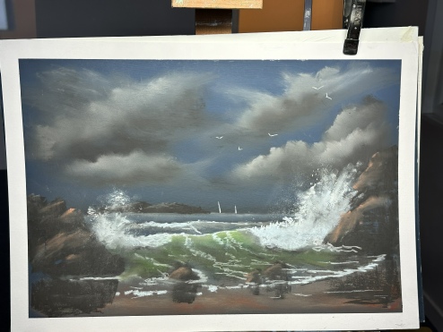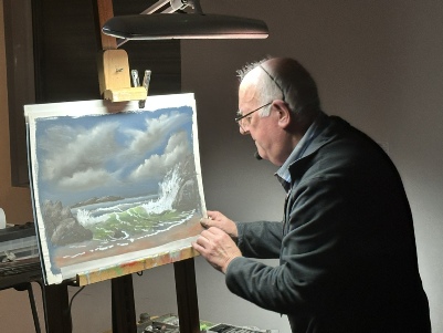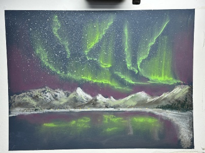 On Tuesday, 9th January, a good turnout of members came to see another demo from Paul Arnott, our secretary, who stepped in to fill a vacant spot in our programme, and was treated to another great treatment of pastel painting. Paul gave us a first picture quite similar to that with which he won the landscape prize in our recent annual exhibition, waves breaking on a beach, followed by one of the Northern Lights, both shown here. Both demonstrations were punctuated with many humorous comments and anecdotes. Many thanks, Paul.