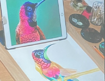 She showed us her technique as to how she builds up a painting in stages. Adele then worked on a painting of a beautifully colourful Hummingbird  with intricate patterns in watercolour & gouache.
