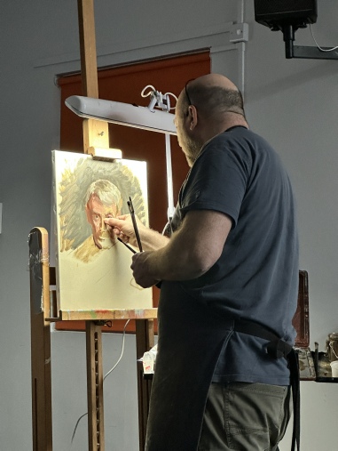 On 16th April, we welcomed back Lee Wright. This time, Lee gave us a splendid demonstration of portrait painting in oils. The sitter was Roger Farrance. It was a useful and entertaining evening, but unfortunately, the portrait was unfinished at the end of the evening. Lee promised to finish it ‘sometime’!