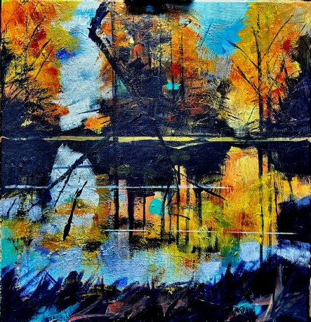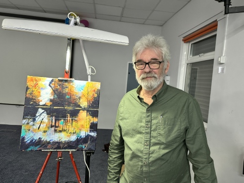 Tuesday evening (5th November) we were entertained by Stuart Roper, a talented artist and illustrator. Using acrylics, Stuart painted a forest lake with trees, starting from a red painted canvas that had been used many times before and so already had an underlying texture.
