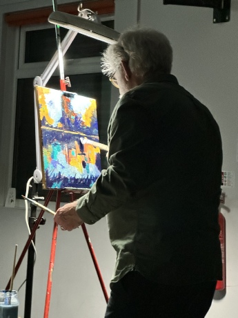 Using  blobby paint strokes to build a colourful landscape with vibrant pigments, he then refined it with detail. Thank you, Stuart, for a very interesting evening.