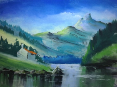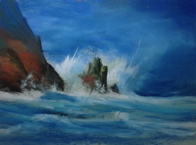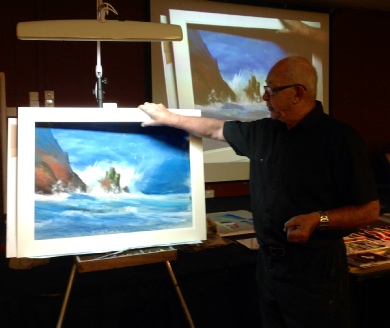 This evening, our guest artist was Arnold Lowrey (SWAS Vice President), who demonstrated use of pastels. He did two pictures, one of mountains & lakes, then the other of cliffs & the sea. A very entertaining session & Arnold shared many useful skills for successful pictures.