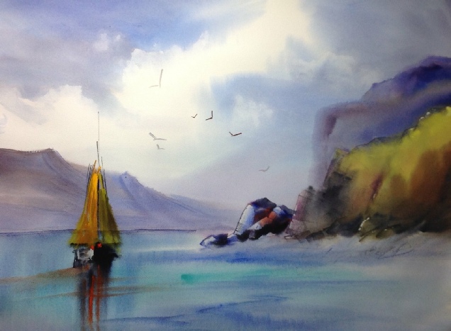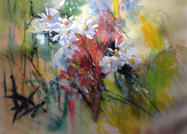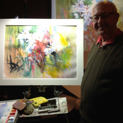 He then worked on large paper, with great skill, to produce two loose pictures, while showing a range of techniques. The first was a coastal scene and the second, flowers.