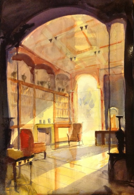 This evening, artist Simon Jones demonstrated painting the interior of a room at the Soane Museum, London. He is an architectural and landscape watercolourist, responsible for the public’s first glimpse of, among other things, The Olympics, Diana Memorial, British Museum Great Court, and many a Chelsea Flower Show. He has an academic background in architecture (BA, AADipl) and is a Fellow of The Society of Architectural Illustration and the Prince’s Foundation. His watercolour landscapes have been exhibited widely including the New Academy Gallery, Waterman Gallery London, Prouds Gallery Sydney &c.