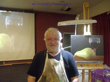 We send a huge 'thank you' to Mike for a dazzling demonstration! 85 members of our Society were treated to an artistic and entertaining evening watching Mike's still life develop in clearly explained steps... the pear 'ripened' before our eyes, and the wine glass dazzled with mellow tones and sparkling lights ... the finished painting was.......edible!!