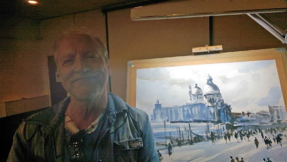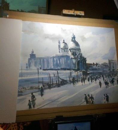 After a frantic drive through Cardiff suburbs to arrive on time (The Curse of the Brynglas tunnels) Trevor gave yet another masterful demonstration to a packed house. The members were entertained, as usual, to an anecdote filled display of direct paint to paper expertise. In just 2 colours, blue and brown, the lagoon, imposing buildings and crowds of people appeared.